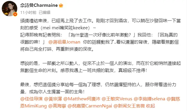 佘诗曼称:“想把这个奖分享给每一个为了理想,仍然选择坚持的人,愿你带着这份力量,成为你人生独挡一面的主角!”